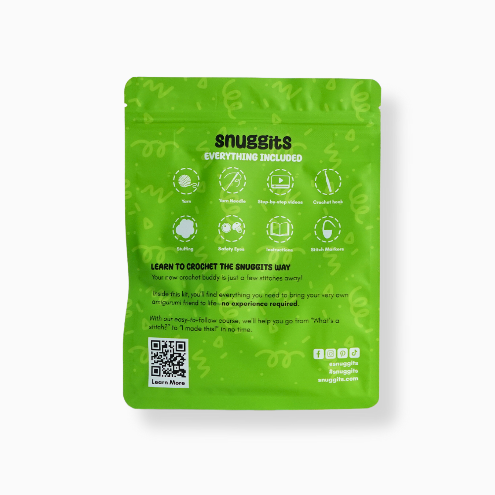 Each kit comes with everything you need: premium Snuggits Yarn (designed for amigurumi and perfect for beginners), a comfortable crochet hook, stitch markers, an embroidery needle for finishing touches, stuffing for that perfect snuggle, an Instructions QR code to access video tutorials, and fun accessories like eyes and extra yarn for creative customization.